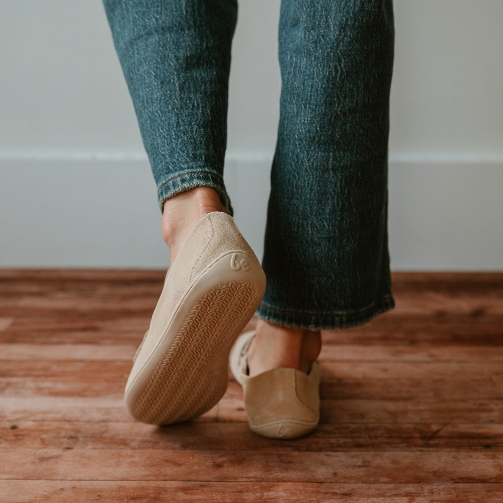 Beige Be Lenka Buena  suede penny loafer with a laser cut vamp and beige rubber soles. Both shoes are shown from the back with the left sole lifted on a woman in loose jeans standing on a wooden floor.