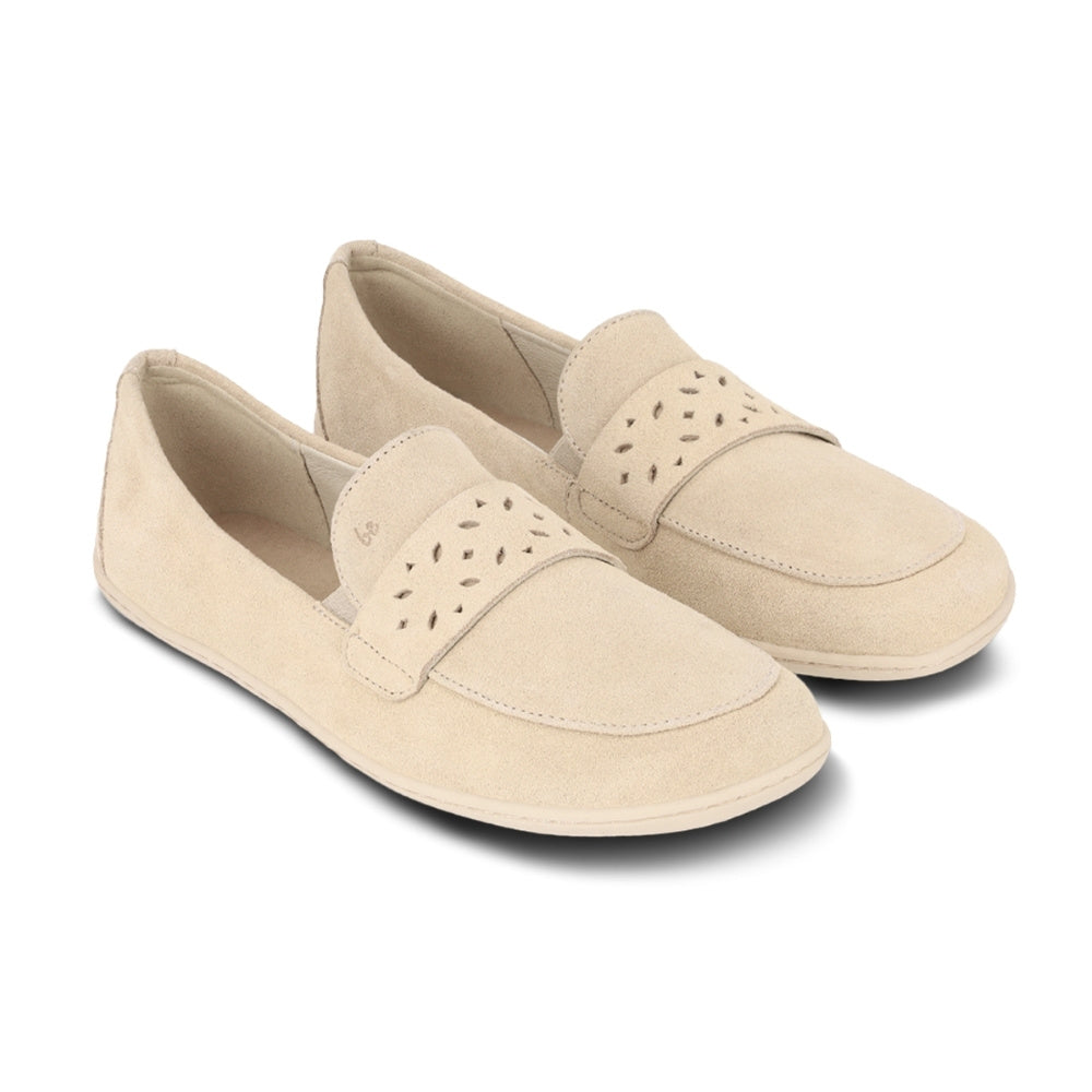 Beige Be Lenka Buena  suede penny loafer with a laser cut vamp and beige rubber soles. Both shoes are shown facing diagonally right against a white background.