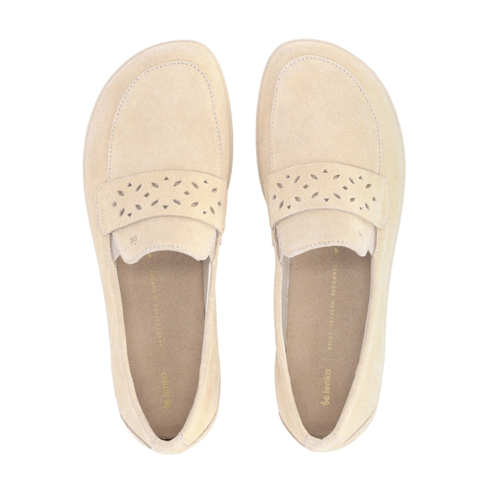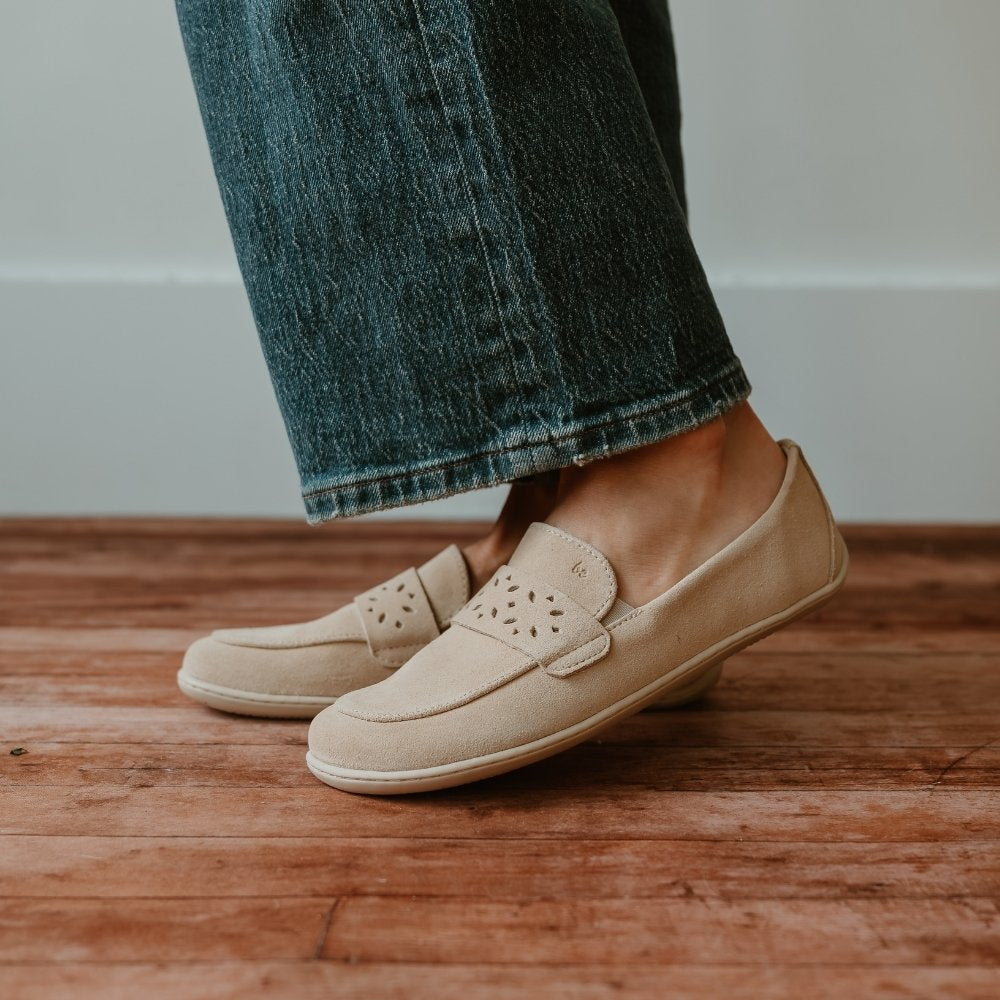 Beige Be Lenka Buena  suede penny loafer with a laser cut vamp and beige rubber soles. Both shoes are shown facing left on a woman in loose jeans standing on a wooden floor.