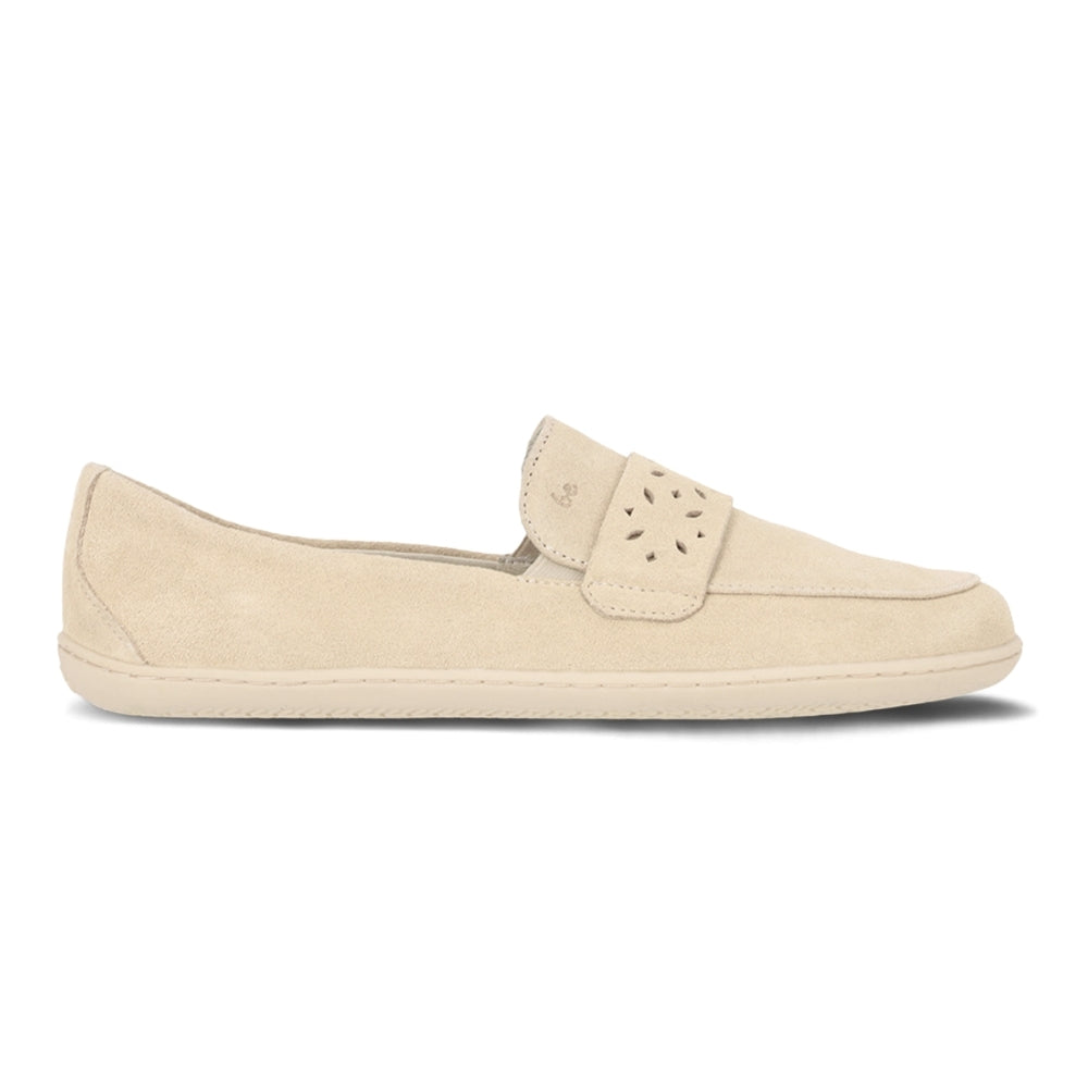 Beige Be Lenka Buena  suede penny loafer with a laser cut vamp and beige rubber soles. Both shoes are shown facing left on a woman in loose jeans sitting on a wooden floor.