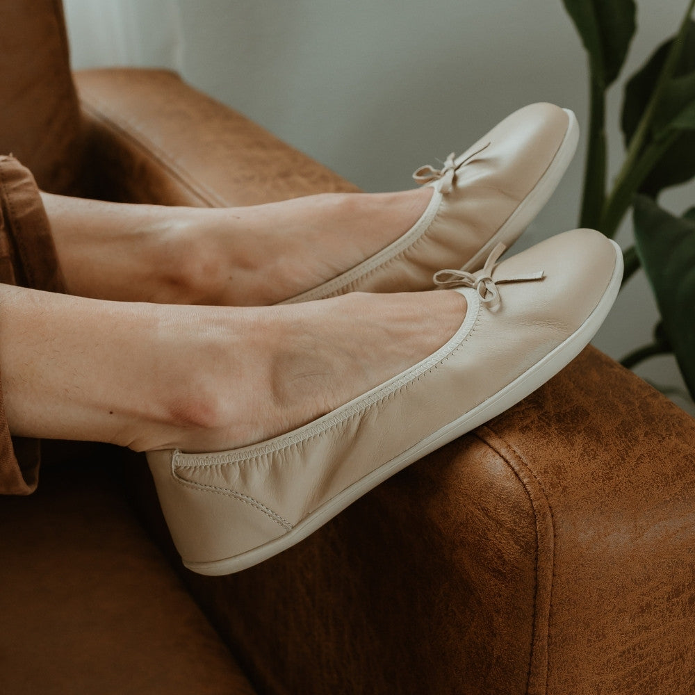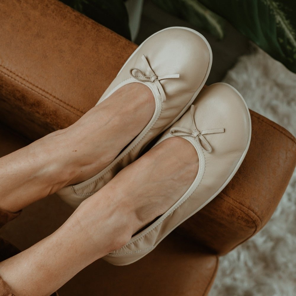 Nude Groundies Ruby leather ballet flat. Shoes are light beige all around with a leather bow and elastic around the opening. Right shoe sole is shown here facing right against a white background.