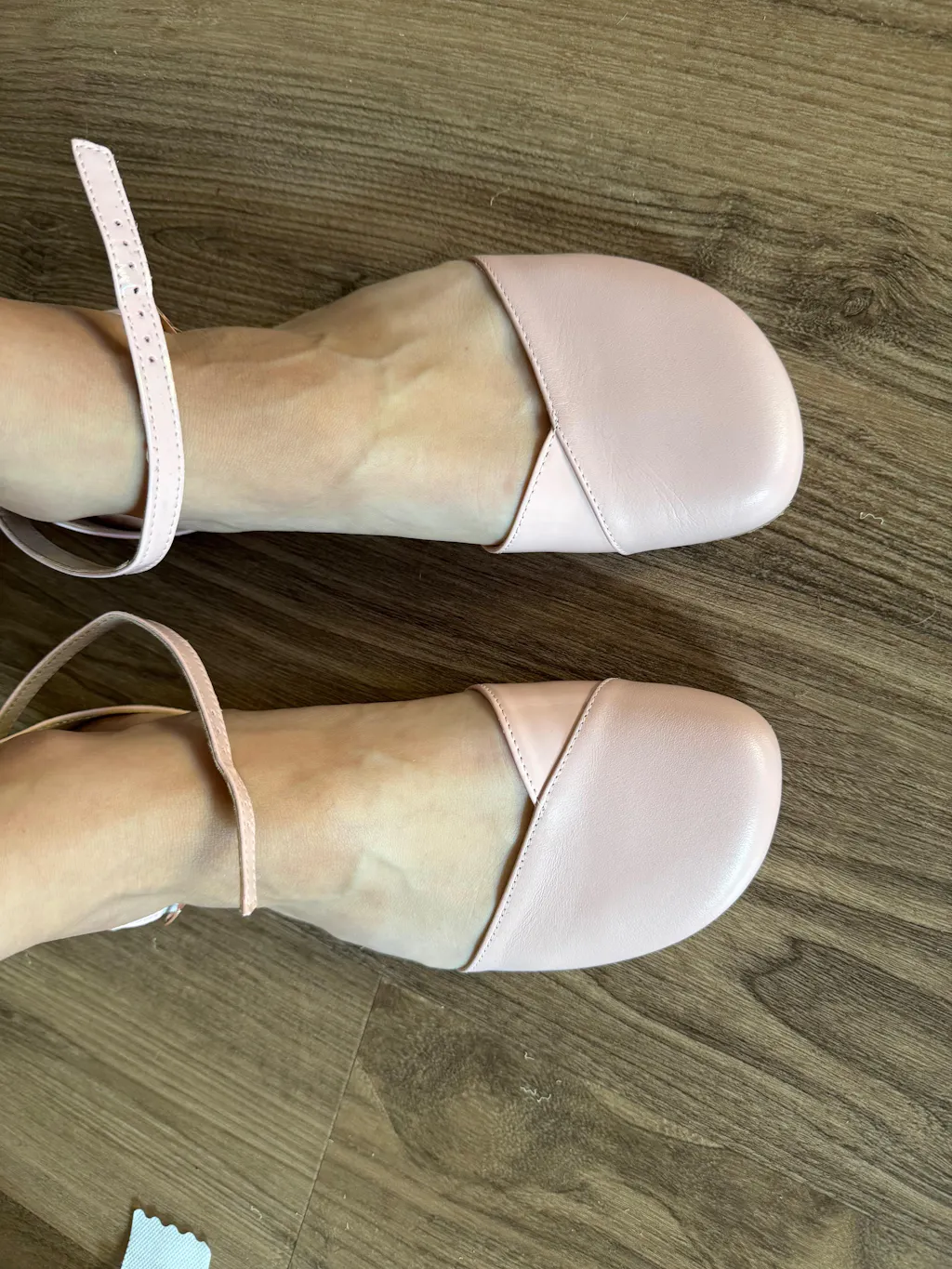 Beige, leather Shapen Poppy D’orsay dressy flats with tan rubber soles. The flats have a heel cup and dainty ankle straps. Both shoes are shown from above on a light-skinned woman standing on a grey brick pathway.