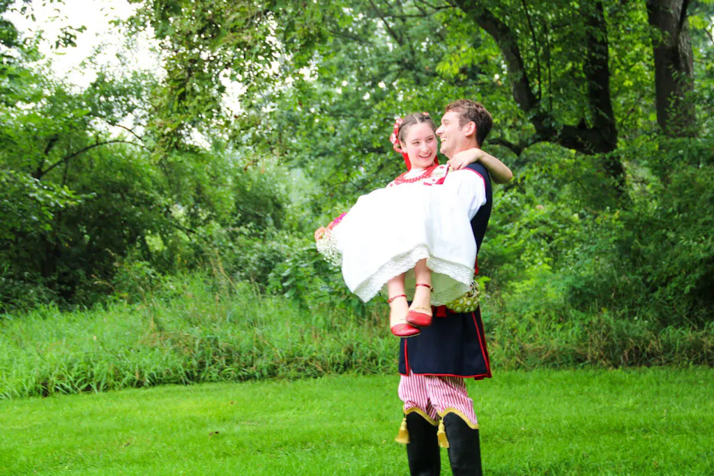 Cognac leather Shapen Poppy D’orsay dressy flats with a tan footbed and tan rubber soles. The flats have a heel cup held on by a dainty, patent leather ankle strap. Shoes are shown from the top-down, outdoors while standing on green grass, partially framed by a flowing skirt.