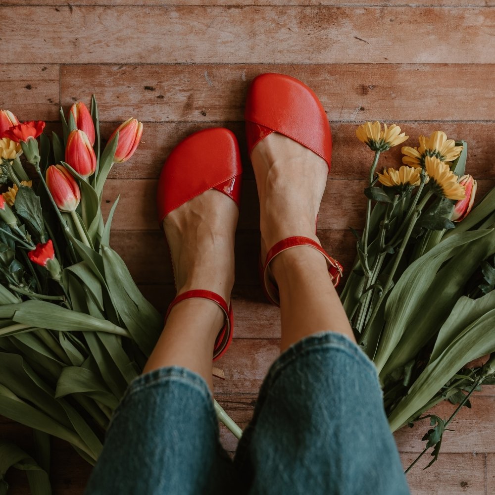 Red leather Shapen Poppy D’orsay dressy flats with a tan footbed and tan rubber soles. The flats have a heel cup held on by a dainty, patent leather ankle strap. Both flats are shown from above a woman standing on a wooden floor surrounded by flowers.