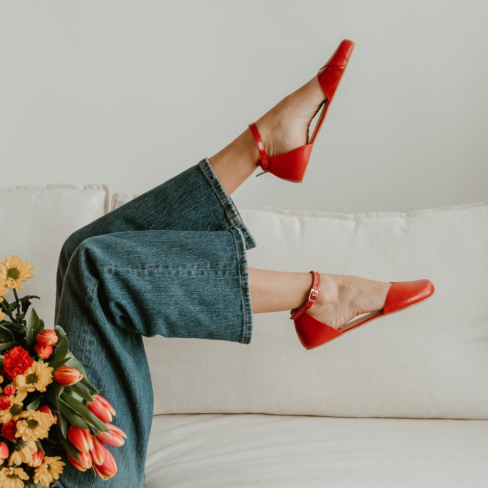 Red leather Shapen Poppy D’orsay dressy flats with a tan footbed and tan rubber soles. The flats have a heel cup held on by a dainty, patent leather ankle strap. Both flats are shown facing right on a woman laying on an ivory couch holding flowers in her lap in a white studio setting.
