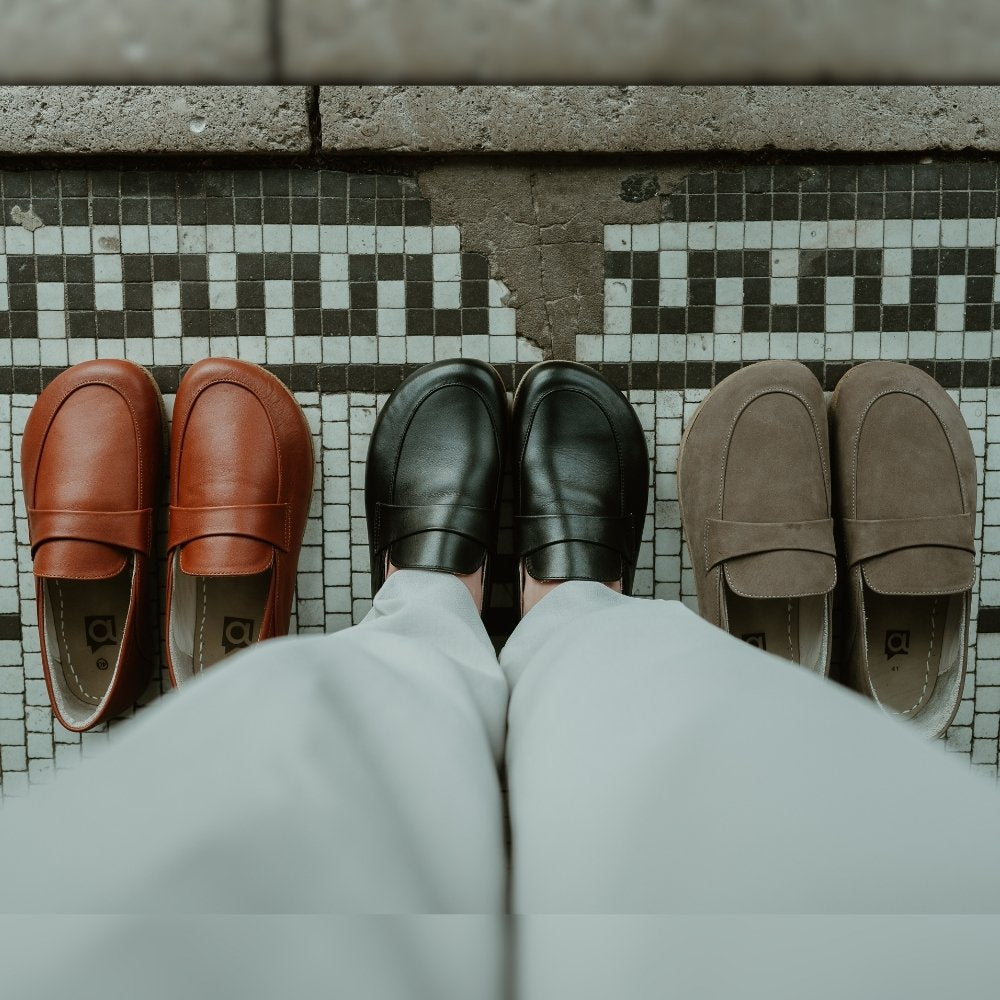 A photo of Dalia Leather loafers Designed by Anya with a leather upper and tan rubber soles. The loafers are a smooth leather upper and have a matching leather strap across the top of the foot for design. Three pairs of loafers are shown from above: a black pair on the left, brown in the middle, and beige on the right. A woman is wearing the right brown loafer with her bare left foot next to it. She is wearing cropped blue jeans and the view is of her knees down.