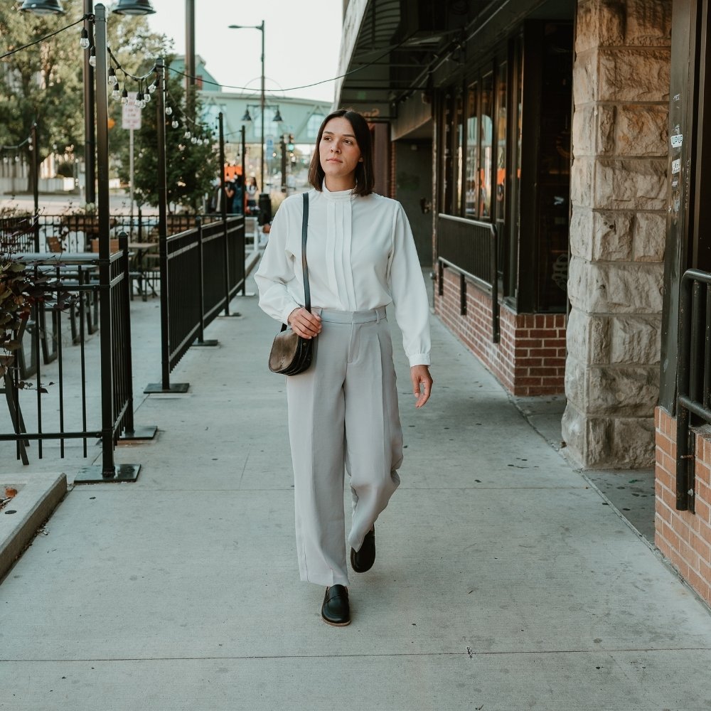 A photo of Dalia Leather loafers Designed by Anya with a leather upper and tan rubber soles. The loafers are a beige smooth leather upper and have a matching leather strap across the top of the foot for design. Both loafers are shown from the right side on a woman’s feet with a view of her knees down. The woman is wearing cropped olive green wide leg pants and is walking on an asphalt road with her right foot in front of her left.