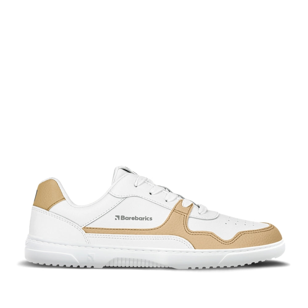 Chunky, white leather Barebarics Zing sneakers with a tan leather trim around the toe box and at the top of the heel. Right shoe sole is shown facing right against a white background.