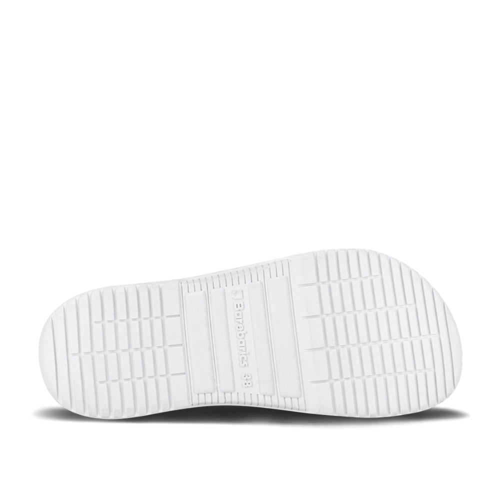 A photo of Barebarics Zing sneakers made with a leather upper and a rubber sole. The sneakers are a white color with perforated spots on the top of the toe box and barebarics branding on the tongue and side. The left shoe is shown from the sole to show the detail against a white background.