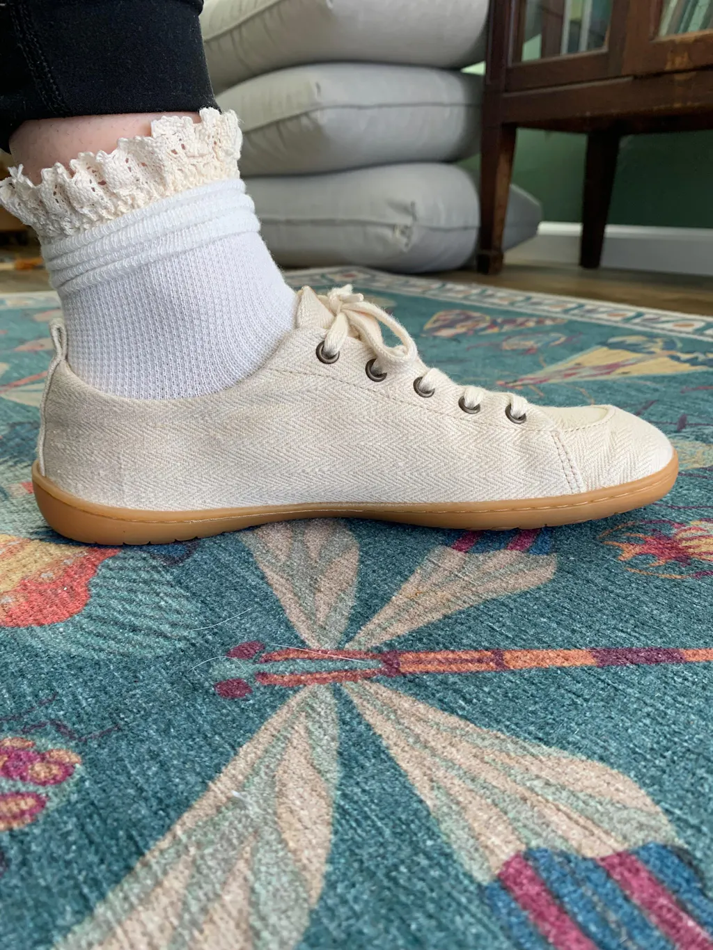 Like another reviewer, I also looked for a long time and tried many shoes. I wanted something light, neutral and closed-toe for spring / summer / fall, preferably a sneaker. This is it! The shoes have an elegant shape, not too wide, and the natural off-white color is beautiful. They work with many outfits / pant shapes. The quality of the materials is apparent. I did add the Mukishoes hemp insert for a touch more padding. Am in between 37 and 38, and 38 was a better fit. Wore them recently over a long day and basically forgot I was wearing shoes.