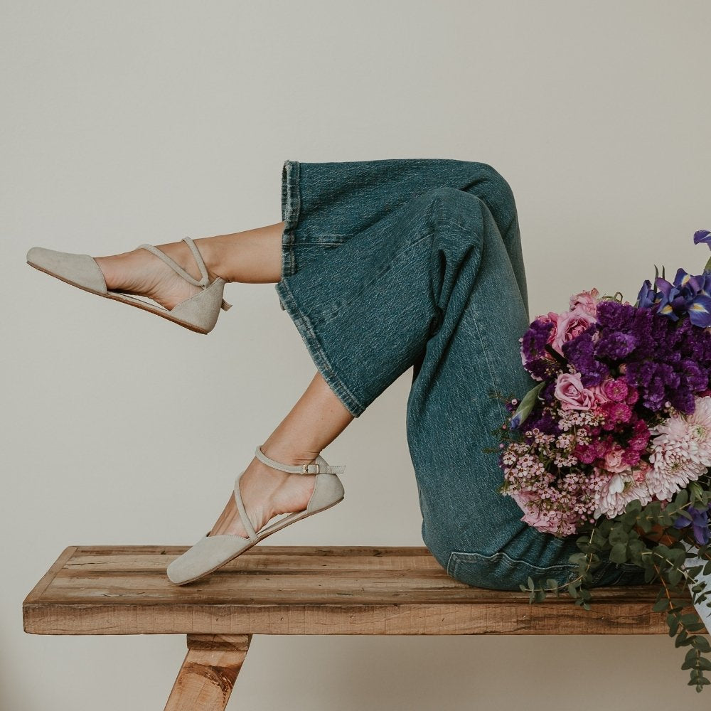 Beige suede leather Shapen Orchid flats with tan rubber soles. A toe box and heel cup bookmark each end of the shoe with a round strap that zig zags from the toe box to the ankle/heel cup to keep the shoes secured to the foot. Styled here  on a woman in jeans laying back on a wooden bench with flowers in her lap in a white studio setting.