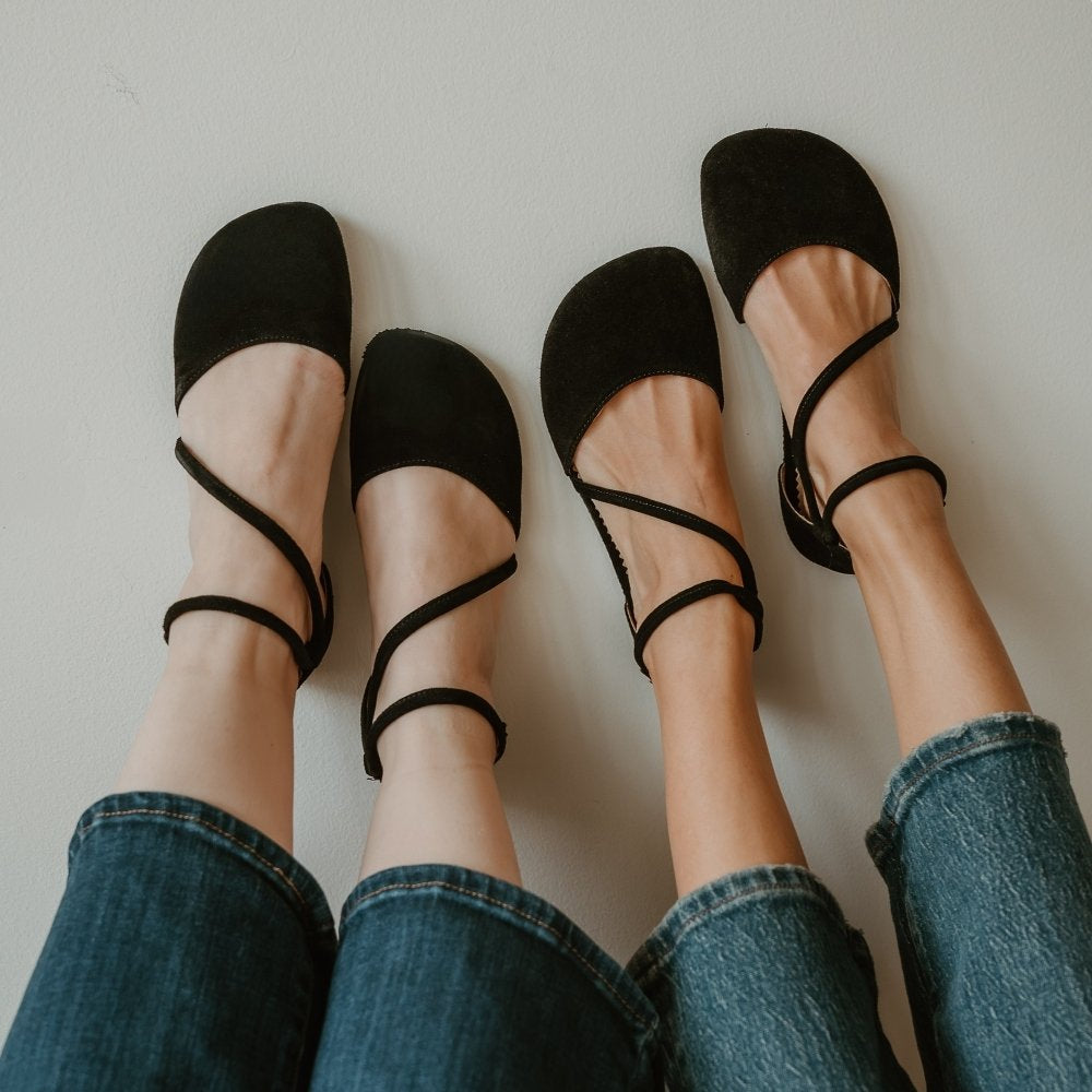 Black suede leather Shapen Orchid with tan rubber soles. A toe box and heel cup bookmark each end of the shoe with a round strap that zig zags from the toe box to the ankle/heel cup to keep the shoes secured to the foot. Both widths of shoes are shown here from above on two women in jeans laying beside each other with their feet on a white wall.
