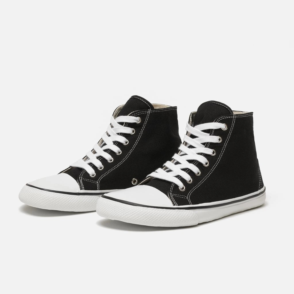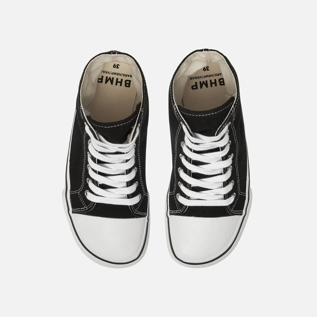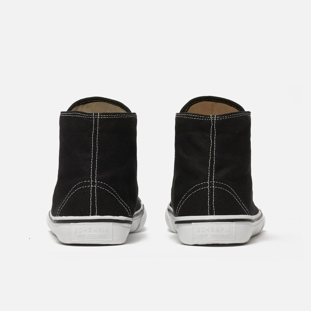 Black Bohempia Orik canvas high tops. Sneakers have a white rubber toe cap with a black outline around the upper white rubber soles. Right shoe in regular width is shown from above next to the Bohempia Herlik light grey in wide for reference against a white background.