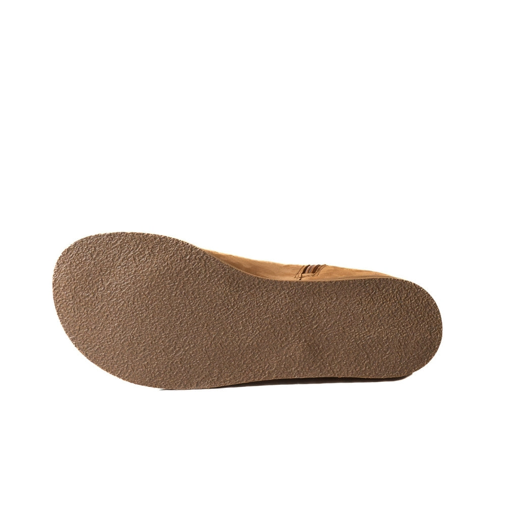 Light brown, nubuck leather western Faye boots By Anya with a western shape on both sides of the ankles, a zipper, tan rubber soles, a welt stitching design around the top of the sole, and a pull tab at the top back of the opening. Right boot sole is shown facing left against a white background.