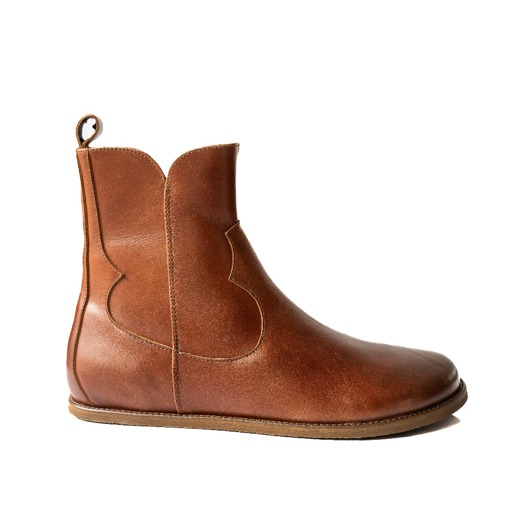 Smooth brown leather western Faye boots By Anya with a western shape on both sides of the ankles, a zipper, tan rubber soles, a welt stitching design around the top of the sole, and a pull tab at the top back of the opening. Right boot is shown facing left against a white background.