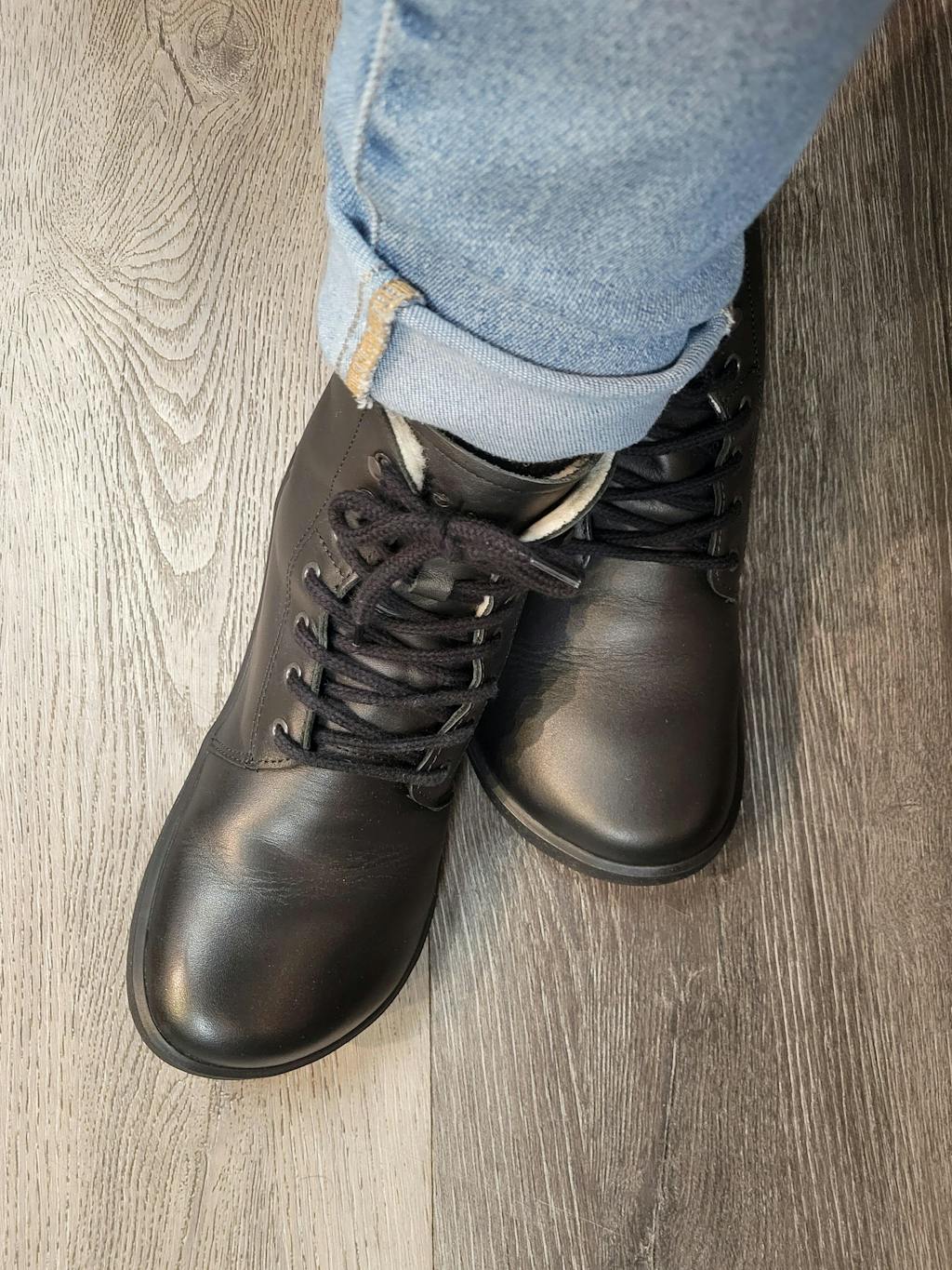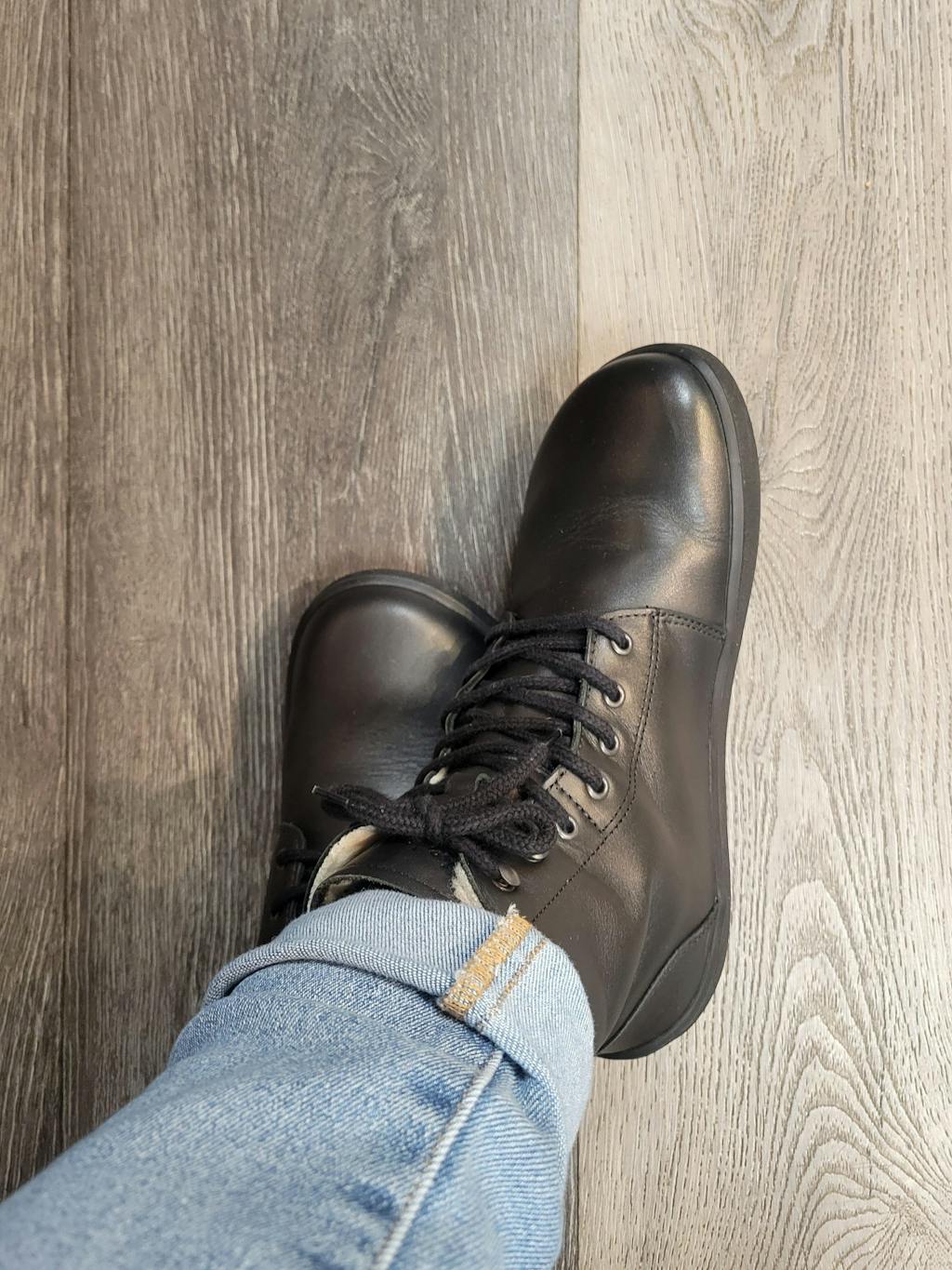 So I had gotten these in 39 before but they were abit tight. Decide to try them in them again but in 40, mainly because i wear thick socks for my cold feet. I have the walnut brown and needed a black pair. I am in love with the matt black but wish the sole was black too. Would go lovely with outfits that require just black shoes. Hence my purchase for the smooth black. The day the arrived, I wore them straight out of the box because I already have the walnut brown so I knew the would be comfortable. Can't stop raving about these boots. The width is one of the main reasons they are my favorite because my toes are happy. I can feel them working the way they should. Not cramped up and squished together and barely able to move. Some days I wear my thin toe socks with them when the weather is mild and the wool lining does a good job of keep my feet warm.